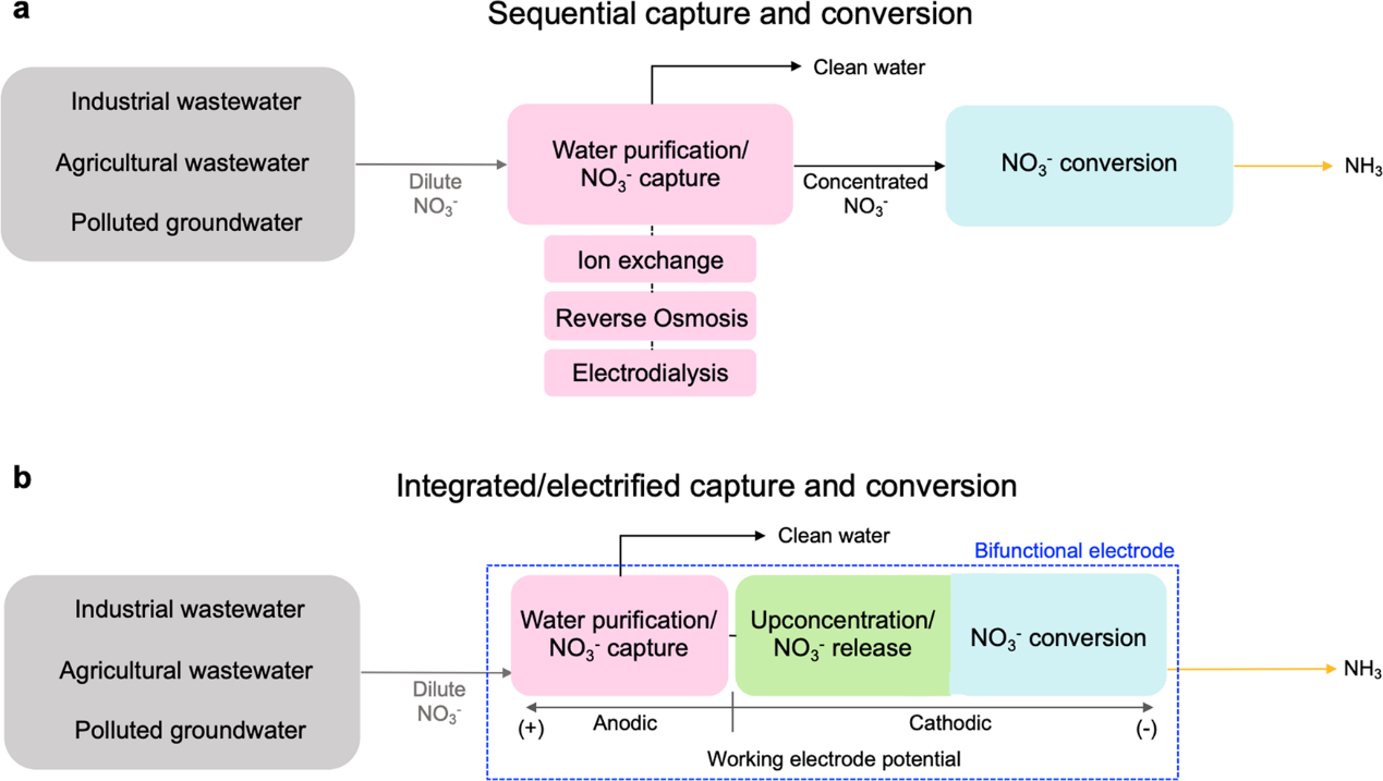 硝酸盐由于其流动性、水溶性和持久性,长期以来一直被认为是一种广泛存在导致富营养化和藻类繁殖的大型污染物。硝酸盐污染主要是由活性氮肥的过度使用和农业制造的氮流失引起的。目前,研究人员已经提出了几种去除硝酸盐的水净化方法,包括离子交换法和反渗透法,但这些方法往往受到高能耗、废物产生以及选择性和容量等因素限制。另外,硝酸盐相比氮气更有可能成为氨生产的一种有前途的氮源。在这种背景下,将硝酸盐电化学转化为氨,作为能源和碳密集型Haber-Bosch工艺的一种可持续的替代方案。硝酸盐高效转化为氨主要局限是传质和副反应。近年来,尽管在实现电化学硝酸盐还原方面取得了显著地进展,但大多数电化学研究都使用较高的硝酸盐浓度(10-1000 mM)来评估催化剂和装置的性能。然而,在自然环境的废水中,硝酸盐浓度通常要稀得多。因此,实现一体化稀硝酸盐捕获、浓缩和高效转化为氨是目前有关硝酸盐的主流研究之一。