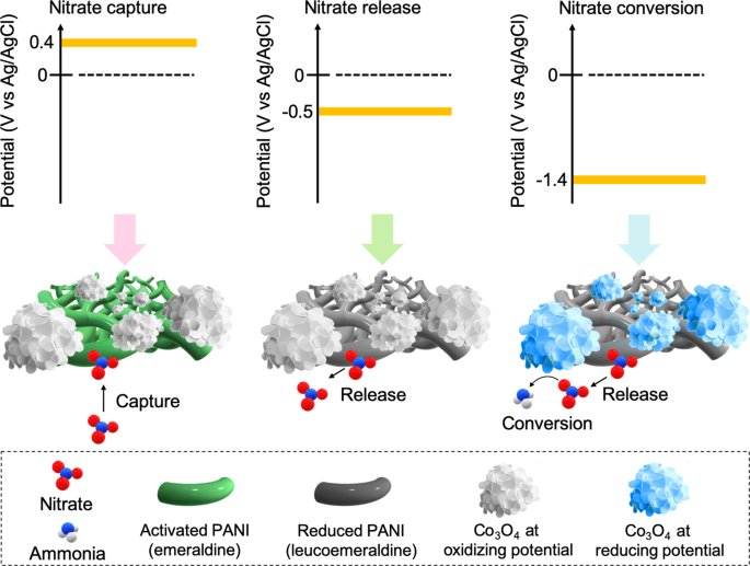 图2双功能PANI-Co3O4/CNT电极示意图。在+0.4 V vs Ag/AgCl阳极充电时,PANI被激活(翡翠绿),并作为硝酸盐的电吸附剂。在阴极充电过程中,PANI被还原为白翡翠绿形式,并释放出吸附的硝酸盐(−0.5 V vs Ag/AgCl),或者PANI再生与Co3O4的硝酸盐电转化为氨(−1.4 V vs Ag/AgCl)。©2023 The Author(s)