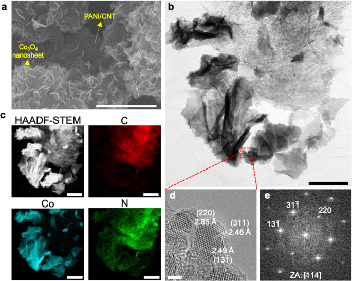 图3 PANI-Co3O4/CNT的形态表征。(a) PANI-Co3O4/CNT的扫描电子显微镜 (SEM) 图像。(b) PANI-Co3O4/CNT的透射电子显微镜 (TEM) 和(c)高角度环形暗场扫描透射电子显微镜 (HAADF-STEM) 图像以及相应的能量色散光谱 (EDS) 映射图像。(d)Co3O4的高分辨率 TEM (HRTEM) 图像和(e)相应的快速傅里叶变换图。©2023 The Author(s)