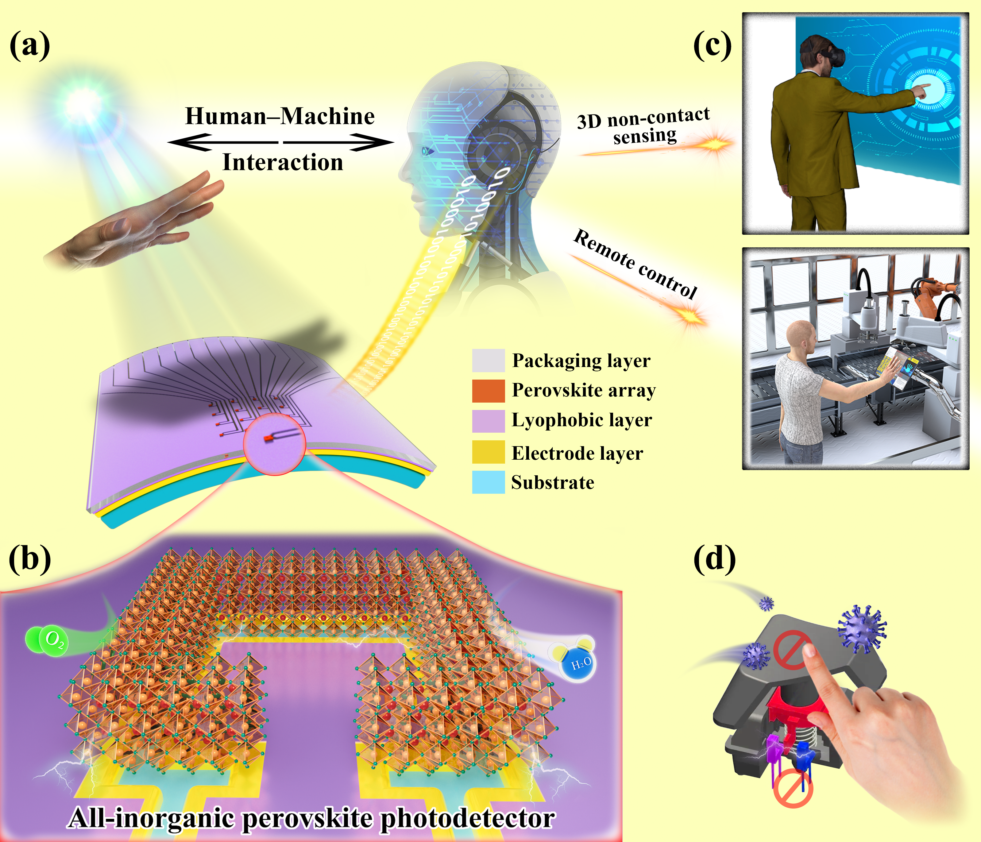 探测距离远且响应快速的光电探测器是构建非接触式人机交互界面的重要媒介。在众多光电材料中,全无机钙钛矿具有优异的光电性能和较好的耐湿、氧性,使其成为高性能光电探测器的优选材料。但全无机钙钛矿的结晶性难以有效控制,并且随着器件的阵列化、柔性化、微型化进程不断推进,迫切需要一种简单、高效和低成本的制备策略来激发钙钛矿微器件在光电传感领域的商业化潜质。