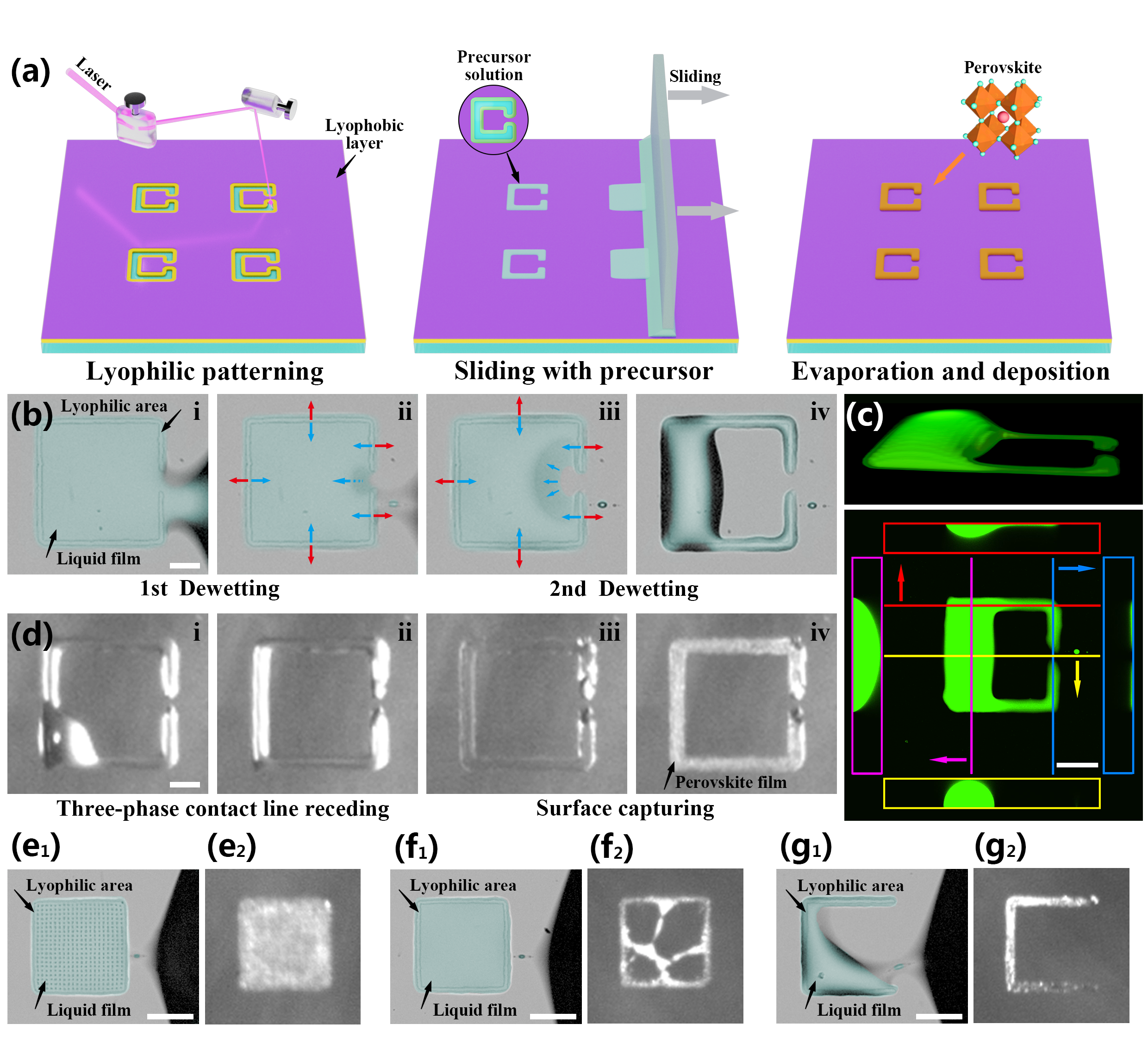 图2. 分裂环型亲液图案辅助去润湿的机制(a)分裂环型钙钛矿晶膜的制备流程图。(b)钙钛矿前驱体溶液的去润湿过程。(c)分裂环型液滴的三维形貌。(d)钙钛矿前驱体溶液的蒸发结晶过程。(e–g)几种典型图案的去润湿以及沉积结果。