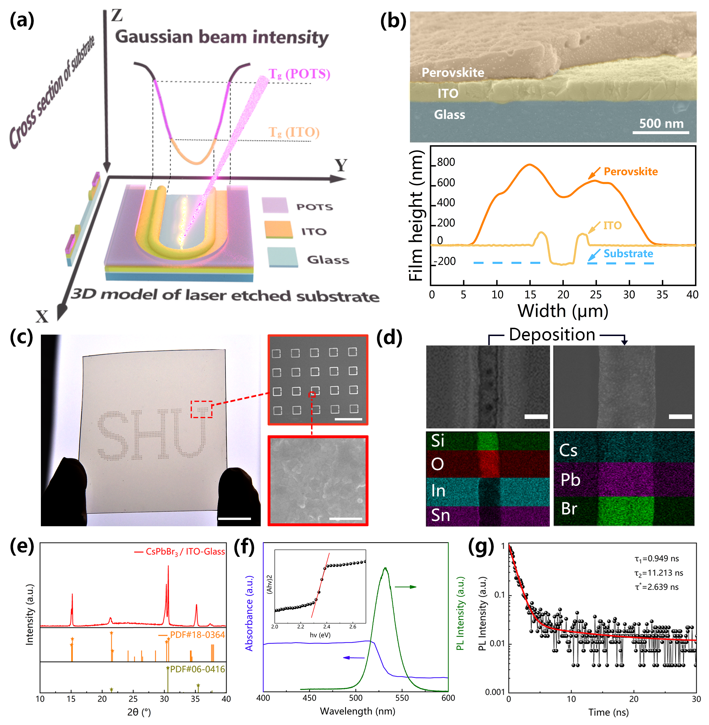 图3. 分裂环结构化钙钛矿晶膜阵列的高通量制备 (a)双功能激光蚀刻的机理。钙钛矿晶膜的(b-d)形貌及成分表征、(e)X射线衍射谱、(f)吸收光谱和发射光谱、(g)时间分辨的荧光衰减曲线。