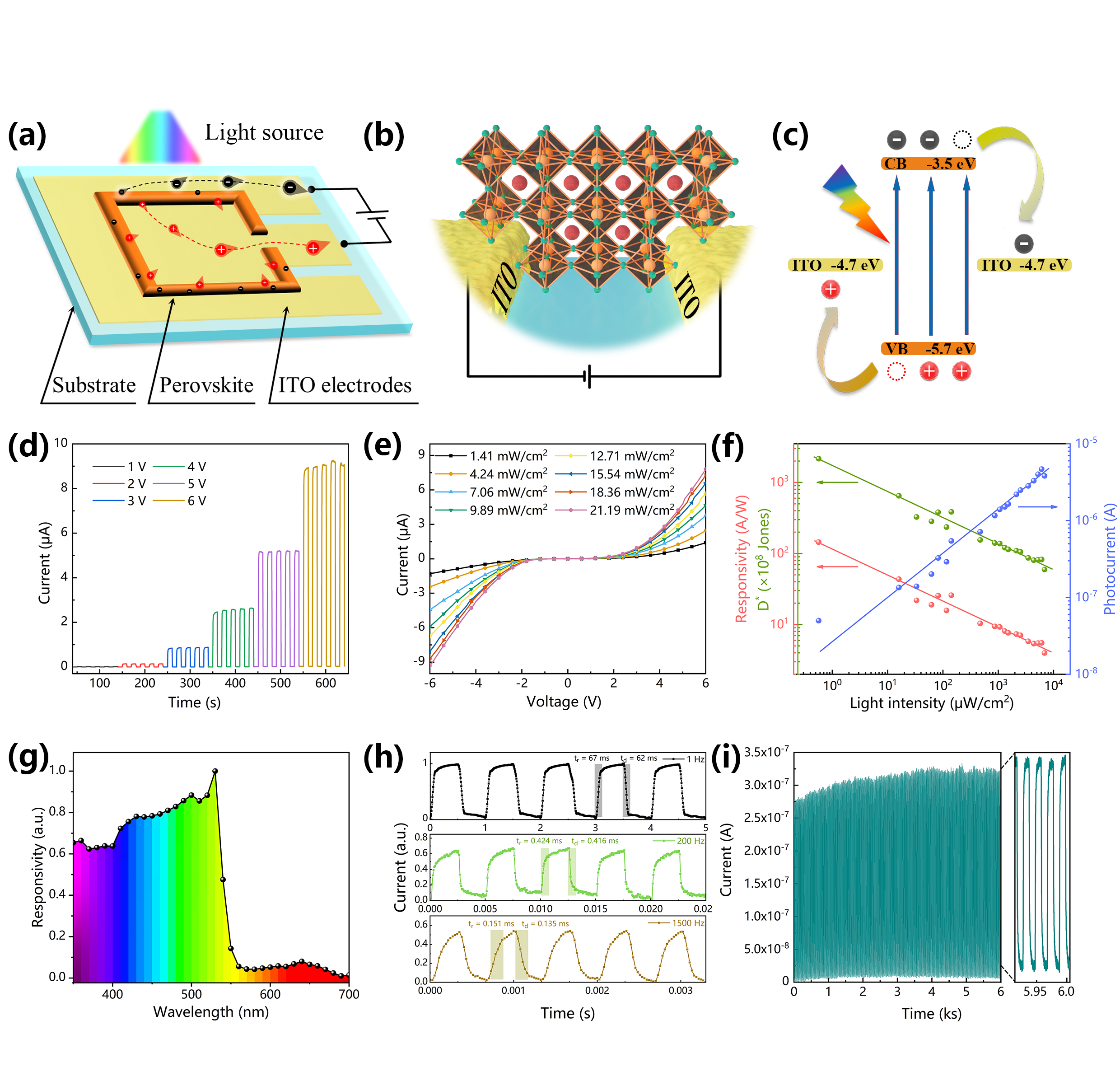 图4. 分裂环型光电探测器的性能(a-c)钙钛矿光电探测器的结构及光电响应机制示意图。(d)不同偏置电压下的I-t曲线。(e)不同光功率密度下的I-V曲线。(f)响应度、比探测率、光电流与光功率密度的关系。(g)光电探测器的光谱响应度。(h)不同开/关频率下的I-t曲线及响应时间。(i)光电探测器在脉冲光照射下的稳定性测试。
