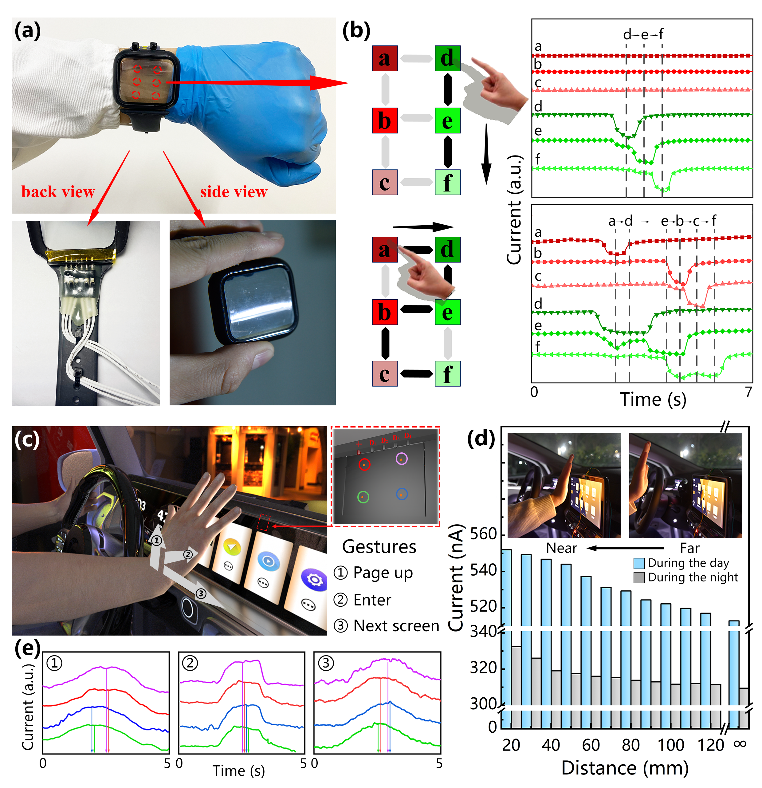图5. 光电探测器阵列应用在柔性可穿戴器件及汽车中控屏(a)光电探测器阵列集成在柔性可穿戴设备的实物照片。(b)数字“1”和“2”的手势书写以及相应的电流数据。(c)光电探测器阵列集成在汽车中控屏幕进行人机交互的示意图。(d)手势运动的三维探测机制示意图以及手掌在不同距离下对应的电流数据。(e)三种交互手势对应的电流数据。