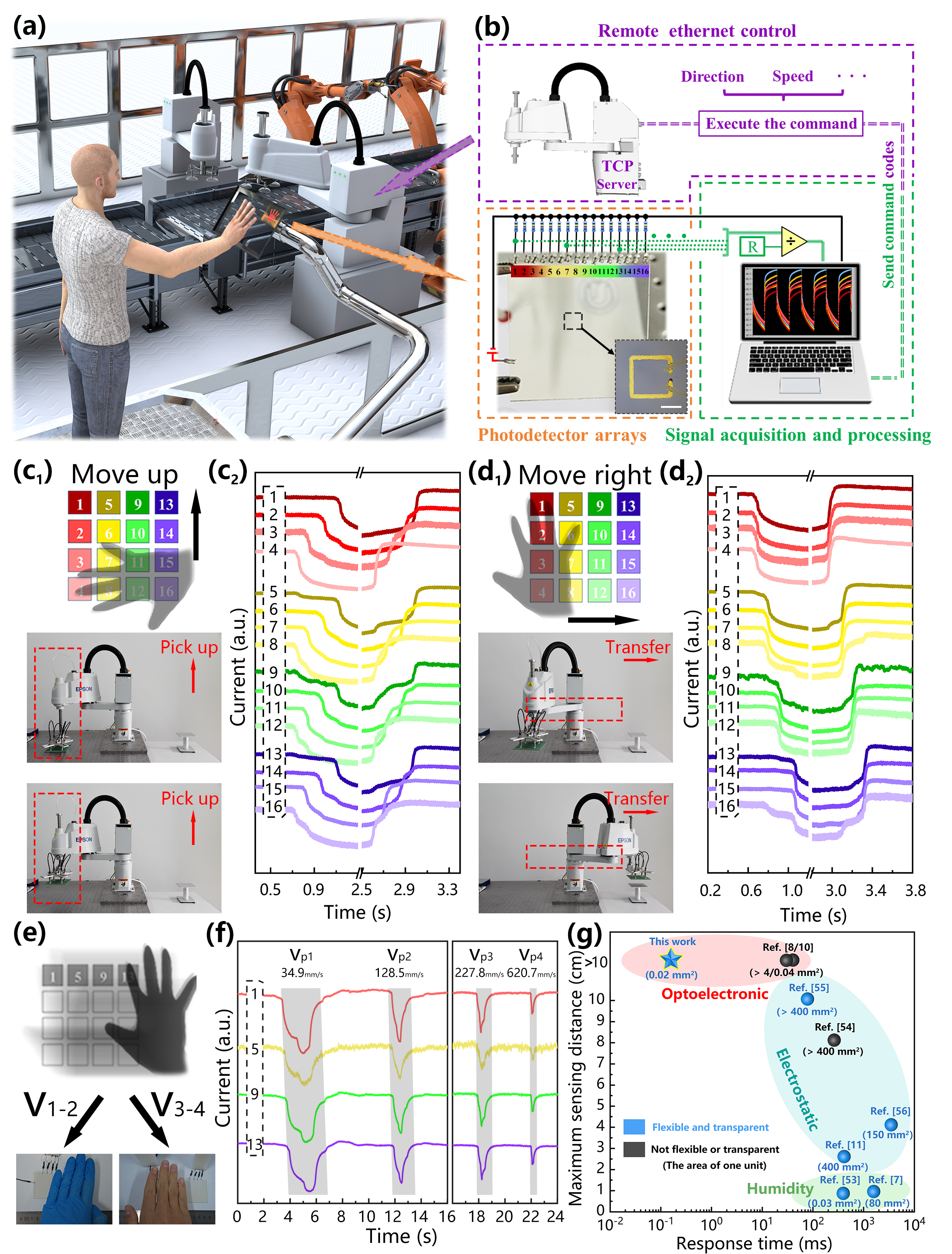 图6. 光电探测器阵列应用在机器人远程控制(a-b)远程控制机器人的应用场景示意图以及该交互系统的组成。(c-d)机器人拾取和转移样品过程的照片及其电流数据。(e-f)手势移动速度的探测过程及其电流数据。(g)本文与其他非接触式手势探测传感器阵列的参数比较。