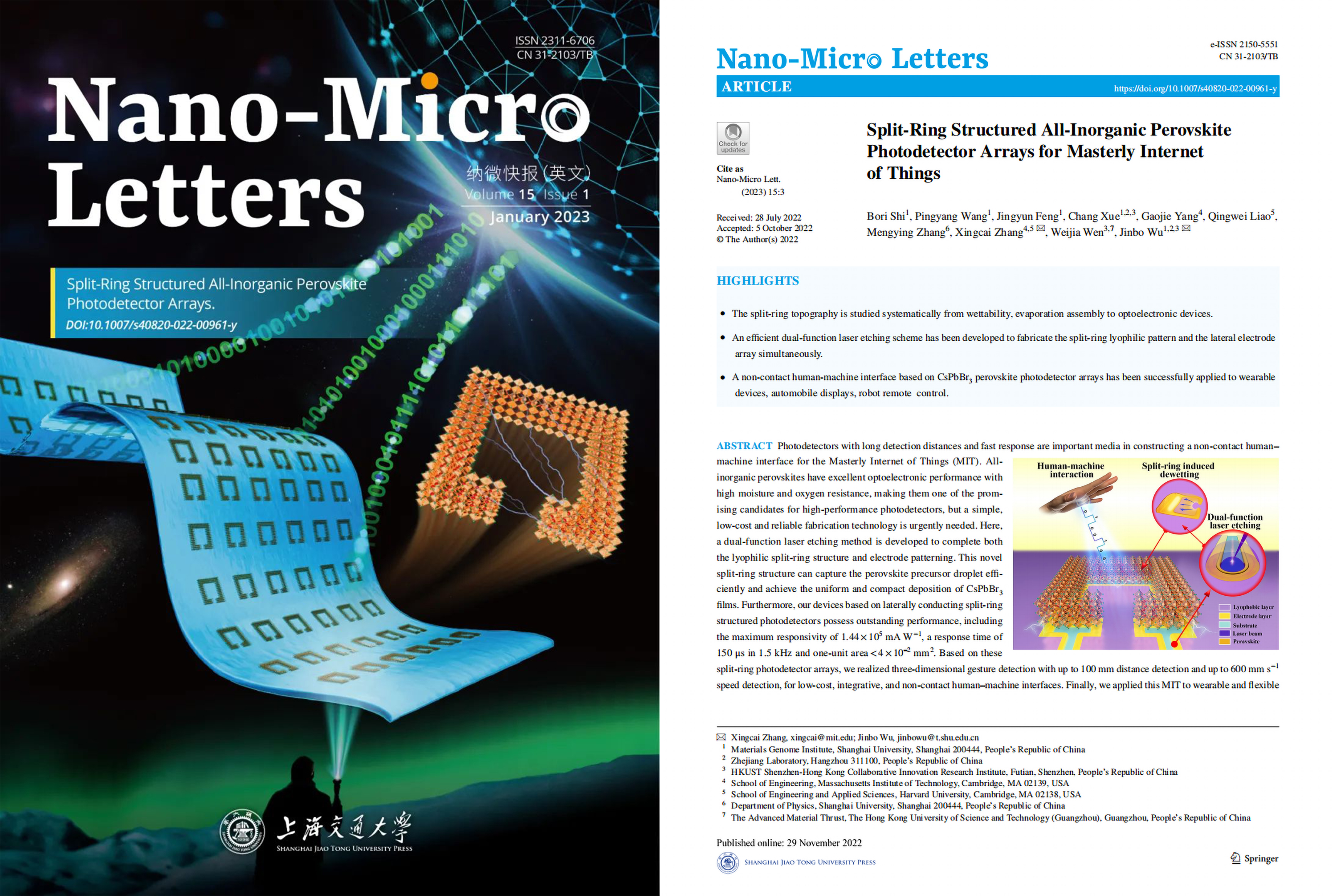 近日,上海大学巫金波课题组与哈佛大学/麻省理工张兴才课题组等通过在疏液修饰的衬底表面进行激光刻蚀的方法,开发了一种新颖的分裂环型亲液图案,该图案可以高效地捕获钙钛矿前驱体液滴,并辅助液滴发生第二次去润湿过程,将大量的液滴定向输运至较小的沉积位点,实现CsPbBr3晶膜的致密、均匀沉积。在此基础上,他们巧妙利用了纳秒脉冲激光的热效应,以同时制备分裂环型亲液图案及对应的图案化电极,极大地简化了阵列式微器件的生产工艺。基于此分裂环型钙钛矿光电探测器,本研究将探测器阵列作为人机交互界面,应用于柔性可穿戴器件进行数字的书写识别、汽车中控屏幕进行三维手势控制以及非接触场景中进行机器人的远程操控,充分展示了该交互界面的广泛应用。该研究成果以“Split-Ring Structured All-Inorganic Perovskite Photodetector Arrays for Masterly Internet of Things”为题,以封面文章发表在国际著名期刊Nano-Micro Letters上。博士研究生石博日为第一作者,上海大学材料基因组工程研究为第一署名单位。上述研究也得到了浙江省之江实验室重点研究项目、国家自然科学基金以及河套深港HTH官网地址 创新合作区项目的资助和支持。