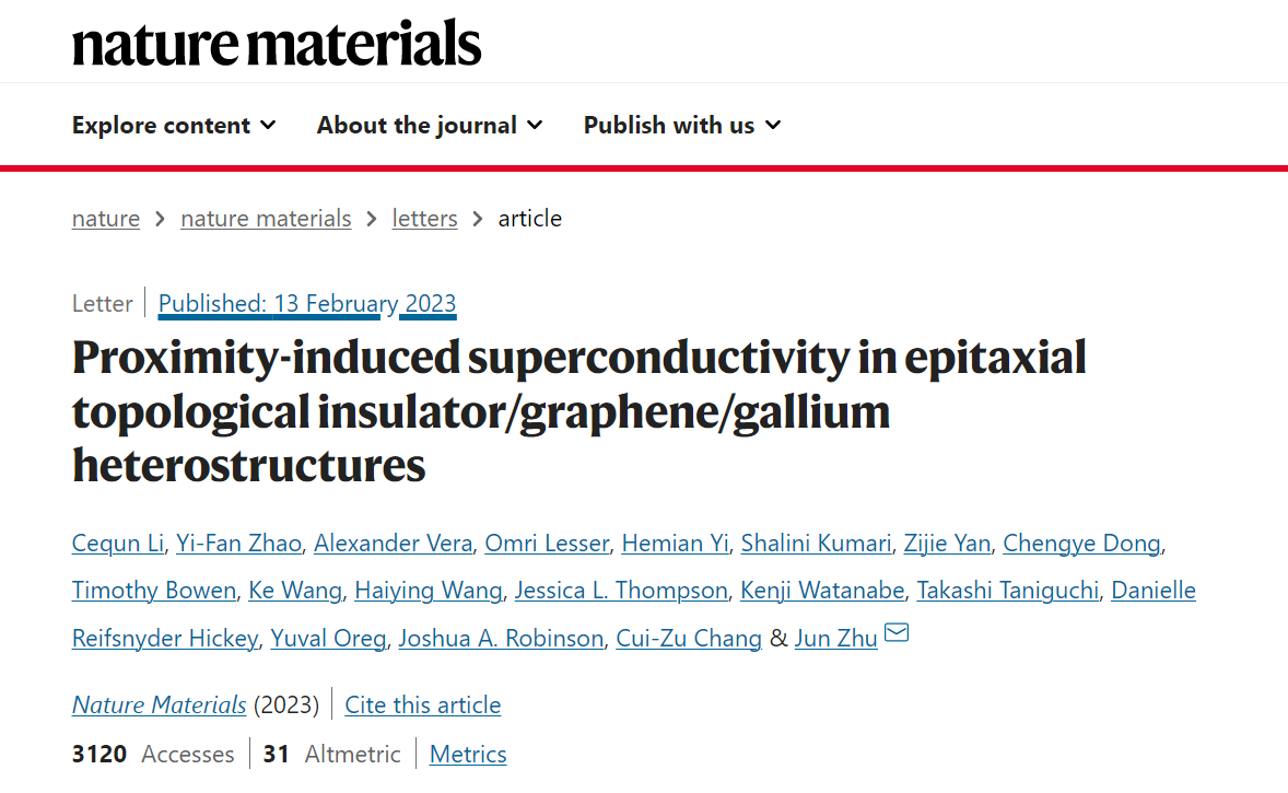 最近,宾夕法尼亚州立大学的Jun Zhu领衔的国际联合团队实现了(Bi,Sb)2Te3/石墨烯/镓(BST/Gr/Ga)异质结构的生长。在两个异质结面实现了原子级别的尖锐层,促进了源于镓膜的超导近邻效应。同时,开发出一种无光刻的范德华隧道结,并且在一个5-10层BST/Gr/Ga结构的狄拉克表面态形成了稳定的、近邻效应诱导的超导间隙。单个Abrikosov涡旋的存在表明了离散的电导变化。第一作者为Cequn Li,通讯作者为Jun Zhu教授。相关文章以“Proximity-induced superconductivity in epitaxial topological insulator/graphene/gallium heterostructures“为题发表在Nature Materials上,宾夕法尼亚州立大学的官网也报道了这一重要进展,该成果为实现量子计算机的规模化应用找到了一种可实现晶圆级量产的材料体系。