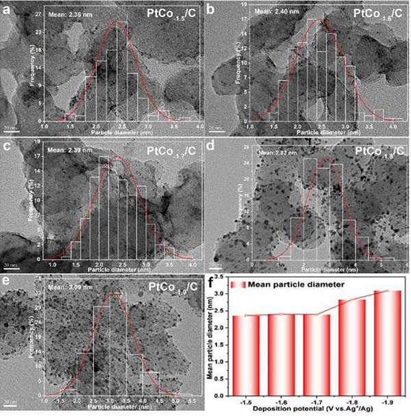 (a-e)在不同沉积电位(PtCo-1.5/C、PtCo-1.6/C、PtCo-1.7/C、PtCo-1.8/C和PtCo-1.9/C)下获得的电沉积PtCo/C催化剂的TEM图像,以及它们相对应的粒径分布;
