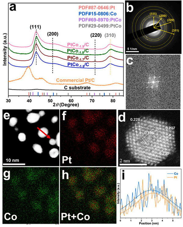 (a)不同PtCo/C催化剂的XRD图谱,以及与商业化Pt/C催化剂的对比;