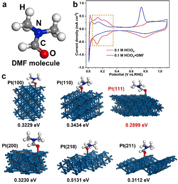 (c)计算了不同Pt单晶面对DMF分子吸附作用下的表面能。