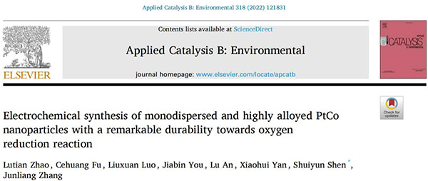 文献链接:“Electrochemical synthesis of monodispersed and highly alloyed PtCo nanoparticles with a remarkable durability towards oxygen reduction reaction”(Applied Catalysis B: Environmental,2022,10.1016/j.apcatb.2022.121831)
