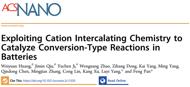 原文链接:Huang, W.; Qiu, J.; Ji, Y.; Zhao, W.; Dong, Z.; Yang, K.; Yang, M.; Chen, Q.; Zhang, M.; Lin, C.; Xu, K.; Yang, L.; Pan, F. Exploiting cation intercalating chemistry to catalyze conversion-type reactions in batteries. ACS Nano 2023, https://doi.org/10.1021/acsnano.2c11029.