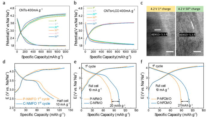 图4 LiCoO2的加入对于(a-c)Na-CO2电池以及(d-f)层状正极补钠性能的提升。