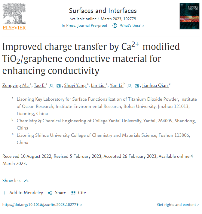 Zengying Ma, Tao E, Shuyi Yang, Lin Liu, Yun Li, Jianhua Qian, Improved charge transfer by Ca2+ modified TiO2/graphene conductive material for enhancing conductivity, Surfaces and Interfaces, 2023, 102779.