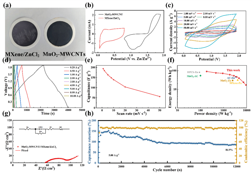 在组装DMZHSCs之前,本工作在水系电解质溶液中对MXene/ZnCl2和MnO2-MWCNTs进行了电荷匹配。MXene/ZnCl2和MnO2-MWCNTs的光学照片如图4a所示。由于MXene/ZnCl2负极的比电容小于MnO2-MWCNTs正极,根据以下公式S+/S–=C–ΔV–/C+ΔV+,将MnO2-MWCNTs正极与MXene/ZnCl2负极的面积比设为1.00:2.60。图4b显示了扫描速率为1.00 mV s-1时负极和正极的CV曲线,表明负极和正极的变化平衡良好。图4c为ZHSCs在扫描速率为1.00~50.00 mV s-1的CV曲线。CV曲线表现出典型的氧化还原峰和较大的电流密度。然后测试了ZHSCs从0.20 A g-1到10.00 A g-1的GCD曲线。如图4d所示,可以观察到对称的GCD曲线,这进一步证明了ZHSCs良好的电化学性能。图4e显示了ZHSCs的比电容与扫描速率的关系。当扫描速率为1.00 mV s-1时,比电容高达194.1 F g-1。即使在50.00 mV s-1下,比电容仍达到56.4 F g-1。如图4f所示,本研究中系统的能量密度和功率密度可达90.1 Wh kg-1和9250.0 W kg-1,远大于同类锂或钠离子电容器。
