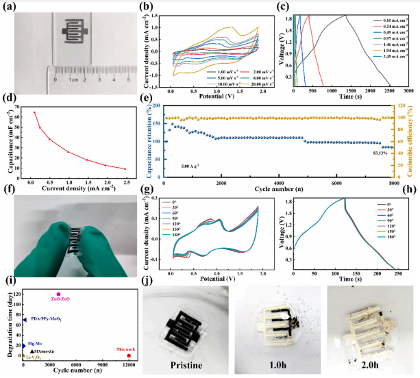 最后,本工作利用激光雕刻的MXene/ZnCl2和MnO2-MWCNTs电极,与MnSO4/ZnSO4凝胶电解质组装成微降解锌离子混合电容器。图5a显示了DMZHSCs的光学照片,说明其尺寸较小。DMZHSCs从1.00 mV s-1到20.00 mV s-1的CV曲线和从0.10 mA cm-2到2.45 mA cm-2的GCD曲线分别如图5b和c所示。ZHSCs的比电容与扫描速率的关系如图5d所示,其在0.10 mA cm-2下具有64.49 F cm-2的高电容。为了测量DMZHSCs的稳定性,在2.45 mA cm-2的电流密度下进行GCD循环。如图5e所示,经过8000次GCD循环后,DMZHSCs仍保持初始容量的83.1%。可穿戴电子设备的储能器件在微型化时必须具有柔性。因此,对DMZHSCs的弯曲性能进行测试。图5f显示了DMZHSCs在弯曲状态下的光学照片以及DMZHSCs为LED供电的照片。测试了DMZHSCs在不同弯曲角度(0~180)下的1.00 mV s-1下的CV和0.97 mA cm-2下的GCD曲线。如图5g和h所示,在不同弯曲状态下,DMZHSCs的电化学性能几乎没有下降,表明DMZHSCs具有优异的柔韧性。随后,对DMZHSC进行了可降解实验,发现仅老化2.0 h后,DMZHSC几乎完全降解。总之,本工作通过实验证明,DMZHSCs具有灵活、安全、环境友好等优点,可在生活中广泛应用。