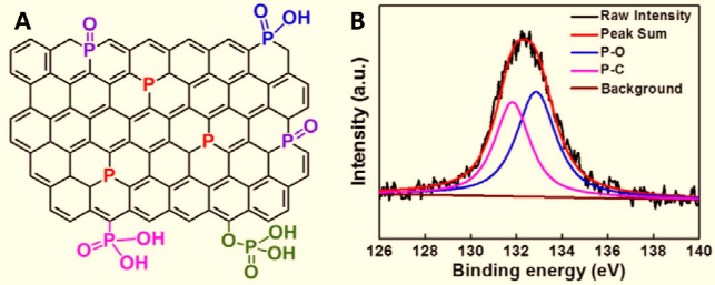 图4. 磷掺杂石墨烯的结构示意图(A)和P 2p XPS光谱(B)。