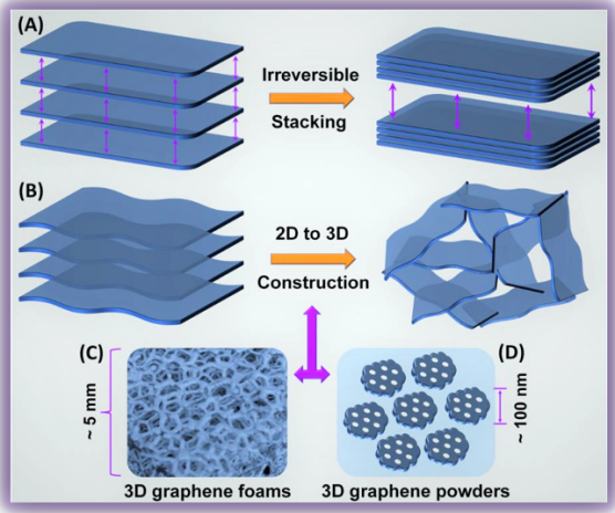 ▲图2三维石墨烯的结构模型:(A)不可逆堆积,(B)三维结构,(C)三维石墨烯泡沫和(D)三维石墨烯粉末。
