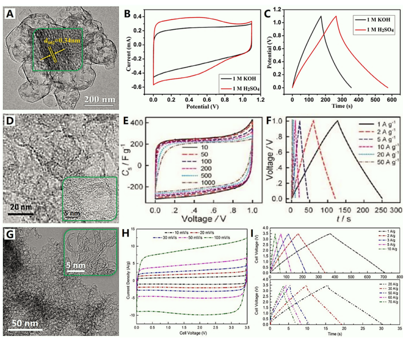 ▲图1 高性能DELCs的类石墨烯碳纳米笼:(A-C)中空类石墨烯纳米笼;(D-F) N掺杂类石墨烯碳纳米笼; (G-I)由相互连接的类石墨烯碳纳米笼组成的碳纳米网。