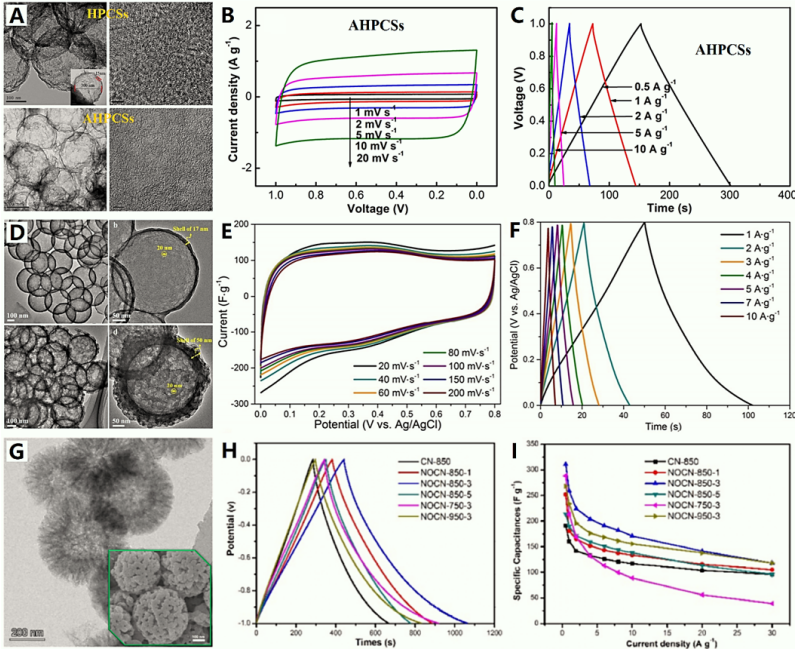▲图2 用于高性能EDLCs的中空多孔(微/介孔)碳纳米球:(A-C)微孔和介孔空心碳纳米球; (D-F) N掺杂大介孔(~ 20 nm)空心碳纳米球; (G-I) N,O共掺杂折叠碳纳米笼(介孔空心碳纳米球)。