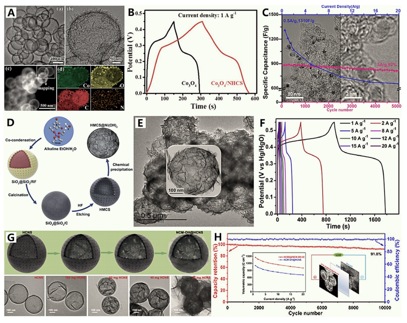 ▲图3 高性能法拉第赝电容器空心碳纳米笼:(A-B)基于N掺杂碳空心球的Co3O4纳米片; (C)固定在碳纳米笼内的小Co3O4纳米颗粒; (D-F) Ni(OH)2纳米片上的空心碳纳米笼包裹结构; (G-H) Ni-Co-Mn氢氧化物纳米片@空心碳纳米笼“瓶中船”结构。