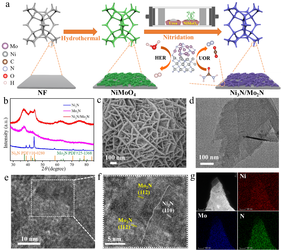 图1. a) Ni3N/Mo2N制备流程图;b) 不同材料的XRD图谱;c-g) Ni3N/Mo2N的SEM、TEM图谱和元素分布图