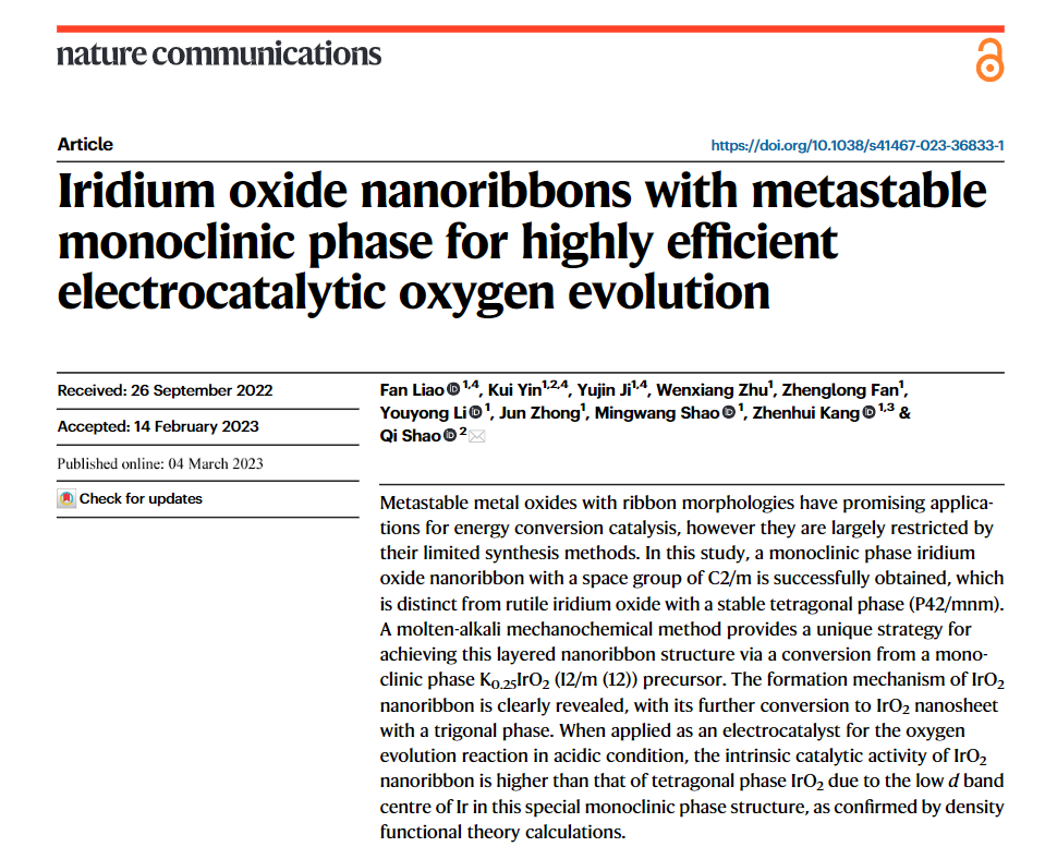 近日,苏州大学邵琪团队等人成功获得空间群为C2/m的单斜相氧化铱纳米带,这与具有稳定四方相(P42/mnm)的金红石氧化铱不同。在酸性条件下表现出远高于四方相IrO2的OER活性。文章以“Iridium oxide nanoribbons with metastable monoclinic phase for highly efficient electrocatalytic oxygen evolution”为题发表在Nature Communications上。