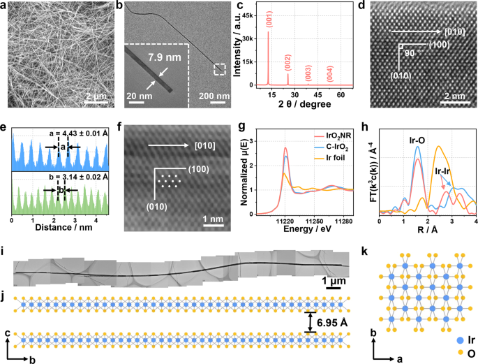 图1 IrO2 NR 的形态和结构。(a)显示 IrO2 NR 均匀分布的 SEM图像。(b)单个 IrO2 NR 的 TEM 图像。(c) XRD 图。(d) HRTEM 图像。(e)由 (100) 和 (010) 平面的 HRTEM线扫描图。(f )IrO2 NR 的 HAADF–STEM 图像。(g)IrO2 NR、C- IrO2和 Ir的XANES光谱和(h) FT-EXAFS光谱。(i)典型的长 IrO2 NR。(j、k)从 a方向和c方向观察 IrO2 NR的晶体结构图。©2023 The Author(s)