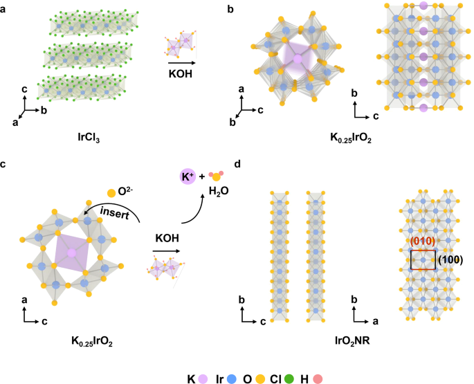 图2 IrO2 NR 的结构演变。(a、b)由IrCl3和KOH原料制成K0.25IrO2。(c、d)从 K0.25IrO2到 IrO2 NR。紫色、蓝色、黄色、绿色和粉红色的球分别代表 K、Ir、O、Cl 和 H 元素。©2023 The Author(s)