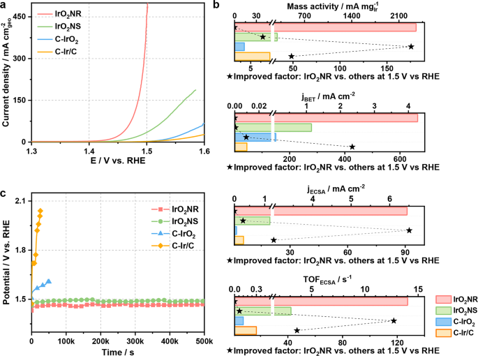 图3 IrO2 NR、IrO2 NS、C-IrO2和 C-Ir/C在0.5 M H2SO4中的 OER 活性。(a ) IrO2 NR、IrO2 NS、C-IrO2和 C-Ir/C样品的 LSV 曲线。(b)基于BET 面积和 ECSA 面积的质量活度和比活度。(c) IrO2 NR、IrO2 NS、C-IrO2和 C-Ir/C样品在10 mA cm –2下的计时电位曲线。©2023 The Author(s)