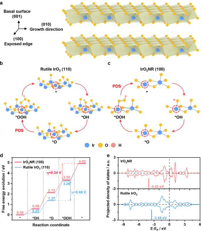 图4 IrO2 NR的OER理论分析。(a)在理论计算过程中,IrO2 NR的晶体结构具有(001)面的暴露边缘。OER在( b )金红石 IrO2 (110)和( c ) IrO2 NR (100)样品上的反应机制。(d)对应的 4e–自由能演化的热力学图。(e)比较金红石IrO2 和 IrO2 NR样品中 Ir 原子的d轨道分布。蓝色、黄色和粉红色的球分别代表Ir、O和H元素。©2023 The Author(s)