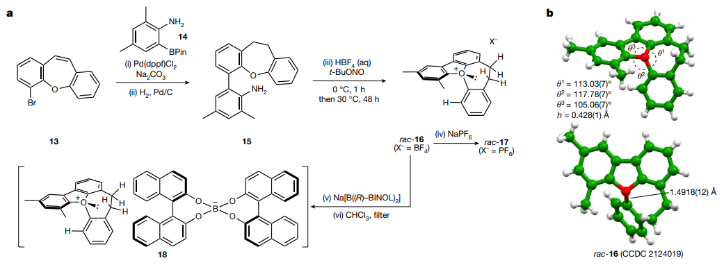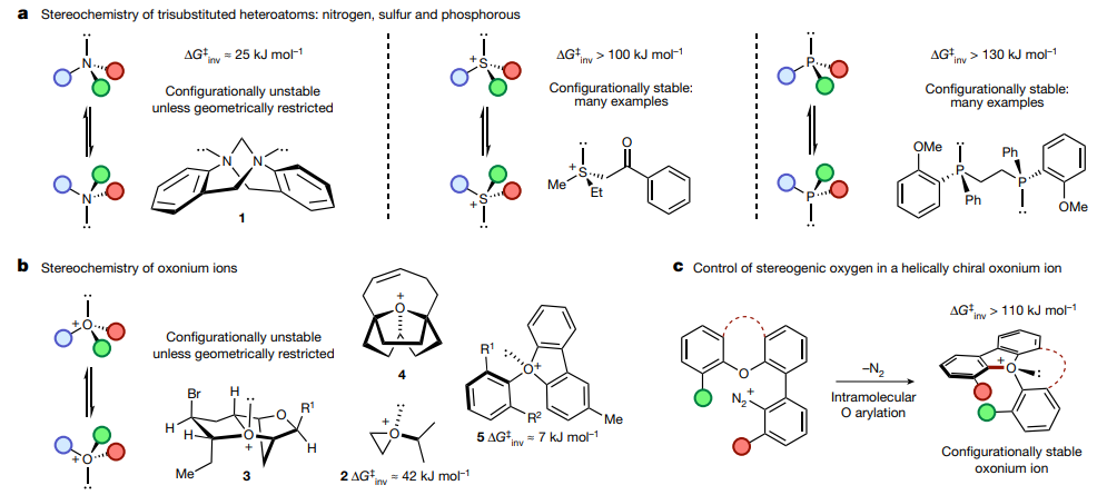 四面体碳立体中心的控制一直是现代合成化学的一个焦点,这得益于它们的构型稳定性。相比之下,三取代的氮、磷和硫化合物会发生金字塔反转,这是一种被广泛利用的基本和公认的立体化学现象。然而,氧鎓离子- -在一个带正电的氧原子上有三个取代基的化合物- -的立体化学发展得很差,除了作为活性中间体存在外,氧鎓离子在合成中的应用很少。构型稳定的氧鎓离子的例子目前没有报道,其中氧原子是唯一的立体化中心,这可能是由于氧金字塔反转的势垒很低,而且所有的氧鎓离子都是高度反应的。