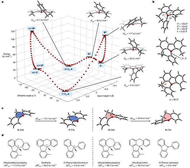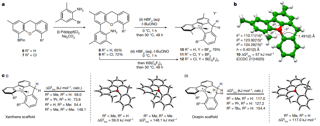 今日,英国牛津大学Martin D. Smith、Jonathan W. Burton课题组与美国科罗拉多州立大学Robert S. Paton课题组合作,描述了一种螺旋手性三芳基氧鎓离子的设计、合成和表征,通过几何限制防止氧孤对的反转,使其能够作为构型的决定因素。结合合成和量子计算方法,提出了能够生成构型稳定的室温可分的盐的设计原则。本工作证明了反演的能垒大于110 k J mol-1,并勾勒了分辨率过程。据我们所知,这是唯一一个手性非消旋且构型稳定的分子,其中氧原子是唯一的立体中心。相关论文以题为“Control of stereogenic oxygen in a helically chiral oxonium ion”发表在Nature上。