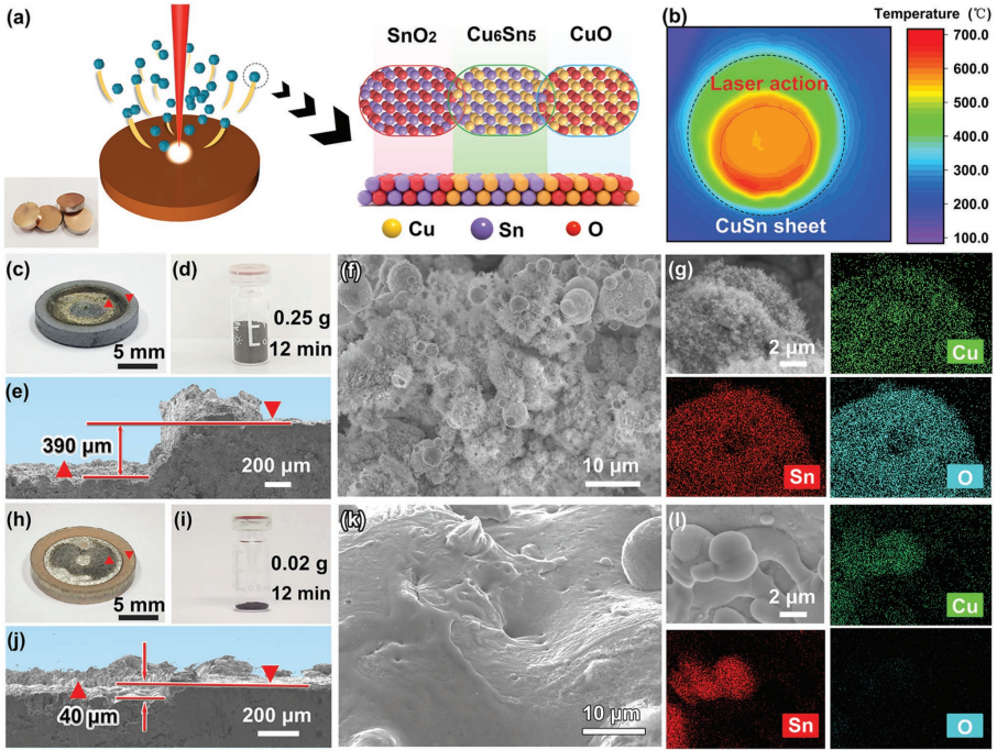 图2. a)激光合成示意图。b)激光作用于CuSn薄板的红外热像图。在c-g)20%O2和80%Ar气氛和h-l)纯Ar气氛下激光烧蚀后的CuSn片的照片、SEM图像和相应元素分布。c、h)激光烧蚀后的CuSn片的照片。d,i)通过激光烧蚀获得的粉末。e、j)激光刻蚀CuSn片的深度。 ©2023 Advanced Energy Materials