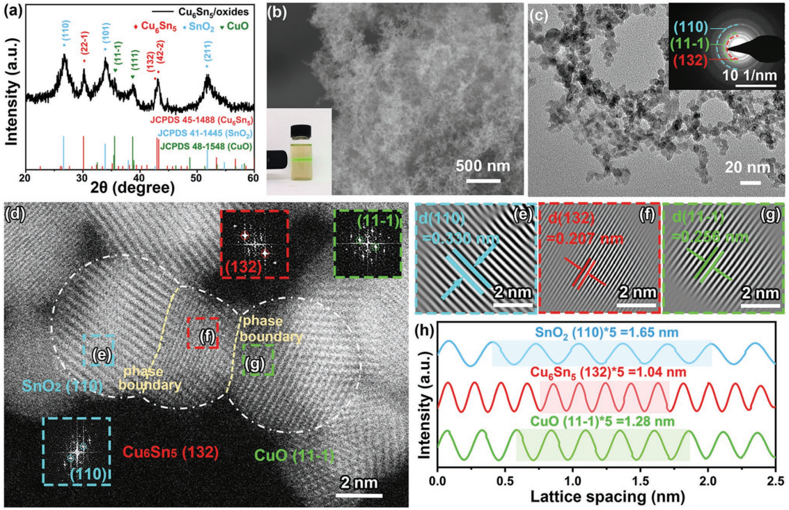 图3. Cu6Sn5/氧化物的a)XRD图案,b)SEM图像,c)TEM图像和相应的SAED图案。d) Cu6Sn5/氧化物的球面像差校正的高分辨率HAADF-STEM图像。例如,d中所选择的SnO2区域; e.Cu6Sn5区域;f.CuO区域;g的FFT和IFFT图案。h)在(d)中所选区域中SnO2(蓝色曲线)、Cu6Sn5(红色曲线)和CuO(绿色曲线)的积分像素强度。©2023 Advanced Energy Materials