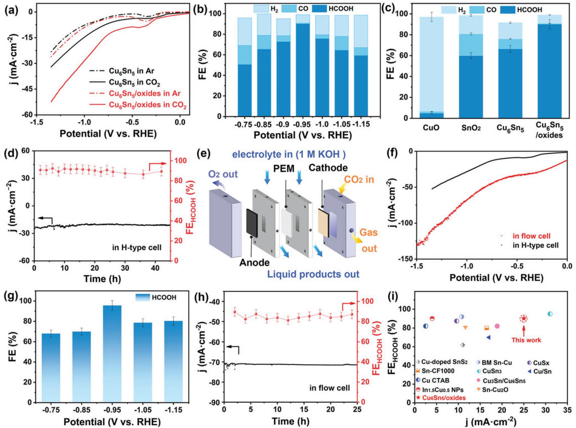 图5. a) 在5 mV s-1的扫描速率Cu6Sn5 /氧化物和Cu6Sn5,在0.5M NaHCO3电解质饱和溶液充满Ar和CO2的极化曲线。b) Cu6Sn5 /氧化物电极在不同的电压下H2, CO和甲酸的法拉第效率。c) 对于Cu6Sn5 /氧化物, Cu6Sn5, SnO2在 -0.95 V vs. RHE电压下的H2, CO和甲酸的法拉第效率。d) Cu6Sn5 /氧化物催化剂在-0.95 Vvs. RHE下长期稳定性45 h和FEHCOOH曲线。e)流动池的原理图。f) Cu6Sn5/氧化物在流通池和H型玻璃池中的极化曲线。g) Cu6Sn5/氧化物在流通池二氧化碳流量为30 sccm的FEHCOOH。h) )Cu6Sn5/氧化物在流通池中-0.95 Vvs. RHE下25 h的长期稳定性和FEHCOOH曲线。i) Cu6Sn5/氧化物催化剂与最近报道铜相比,Sn-based催化剂的FEHCOOH。©2023 Advanced Energy Materials
