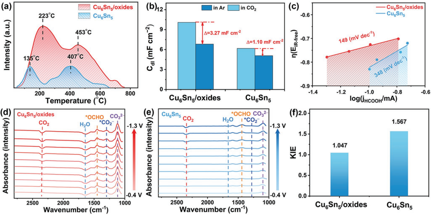 图6. a)Cu6Sn5和Cu6Sn5/氧化物的CO2-TPD光谱。B)Cu6Sn5和Cu6Sn5/氧化物在CO2和Ar中在给定电位(-0.1 V vs RHE)下的双层充电电流(Cdl)。c)Cu6Sn5/氧化物和Cu6Sn5的塔菲尔斜率。d,e)Cu6Sn5/氧化物(d)和Cu6Sn5(e)在不同施加电势下的原位ATR-SEIRAS光谱。f)在-0.95 V vs. RHE下测量的Cu6Sn5和Cu6Sn5/氧化物的KIE。©2023 Advanced Energy Materials