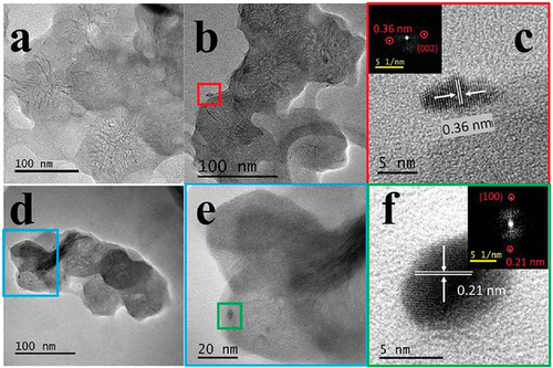 图2 CDs/CNHs的TEM和HRTEM图。a、b、d、e)CDs/CNHs 在低倍率下的 TEM 图像。c,f)分别在 (b) 和 (e) 中显示的红色和绿色区域的 HRTEM显微照片。(c)和(f)处的插图显示CDs的FFT。© 2023 Wiley