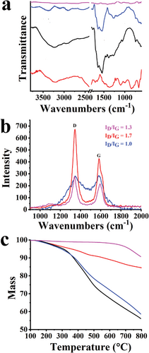 图3 a) ATR-IR 光谱、b) 拉曼光谱(514 nm)和c)在氮气气氛下获得的 CDs/CNHs(红色)、CDs(黑色)、oxCNHs(红色)和原始CNHs(粉红色)的热重分析图。© 2023 Wiley