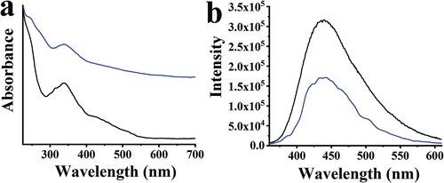 图4 CDs/CNHs(蓝色)和 CDs(黑色)在水中的a) 吸收和 b) 光致发光光谱。© 2023 Wiley