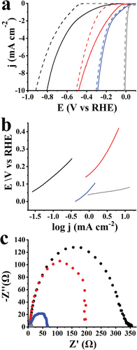 图5 a) HER在10000次循环之前(实线)和之后(虚线)的LSV,b) Tafel 斜率,和 c) Nyquist 图,CDs/CNHs(蓝色),CDs(黑色),ox-CNHs(红色),和 Pt/C(灰色)。在0.5 M H2SO4水溶液中以1600 rp 转速和5 mV s-1扫描速率获得LSV 图。© 2023 Wiley