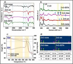 图2 (a)FT-IR光谱,(b)拉曼光谱,(c)DSC/TGA 曲线,(d)缺陷ZnS颗粒的EDS图和元素组成比。
