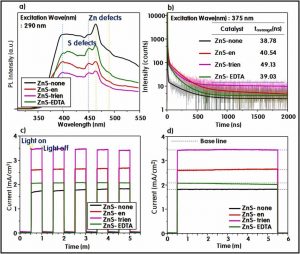图6(a)水裂解制氢气,(b)使用缺陷ZnS颗粒进行光还原,(c) ZnS-en的水裂解反应,(d)ZnS-trien的光还原的耐久性。