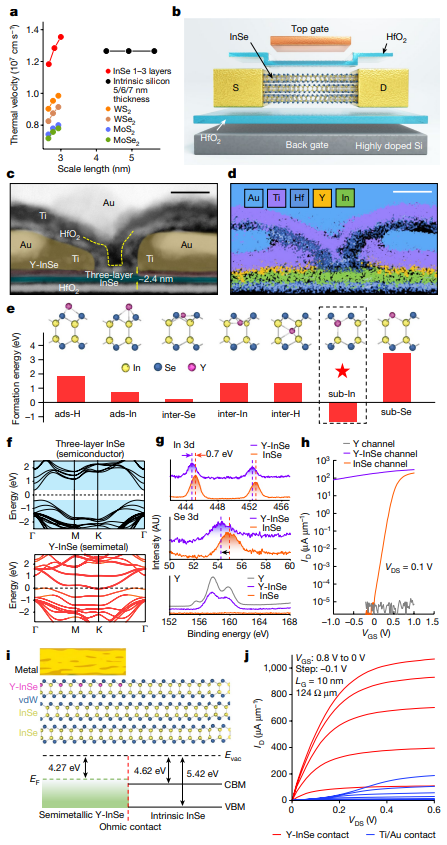 图1 弹道InSe fet的结构和电子特性。a,硅和典型二维半导体材料中的热速度和尺度长度。b,双栅InSe场效应晶体管的原理图。c,d,显示双栅结构InSe场效应晶体管截面的透射电子显微镜图像和电子能量损失谱图。e,计算Y-InSe体系中可能掺杂或吸附构型的形成能。f,计算得到三层InSe的能带结构和钇掺杂诱导的相变接触区(其中Y原子在InSe的顶层被取代掺杂)。g, Y-InSe与独立InSe相比XPS谱的位移(均为C 1s峰,284.8 eV)。AU,任意单位。h,两种弹道装置的传递特性VDS = 0.1 V,包括Y-InSe通道(紫色曲线)、纯InSe通道(橙色曲线)以及与1 nm Y通道的比较(灰色曲线)。i,掺钇诱导相变接触示意图侧视图。纯半导体InSe与半金属Y-InSe的带向比对。CBM,导带最小值;VBM,价带最大值;vdW,范德瓦尔斯。j,采用y掺杂诱导相变接触的典型10 nm弹道InSe FET和直接采用传统Ti/Au接触的典型10 nm InSe FET的输出特性。采用y掺杂(y –掺杂)诱导相变接触的弹道InSe场效应管的总电阻约为124 Ω μm。 ©2023 Nature