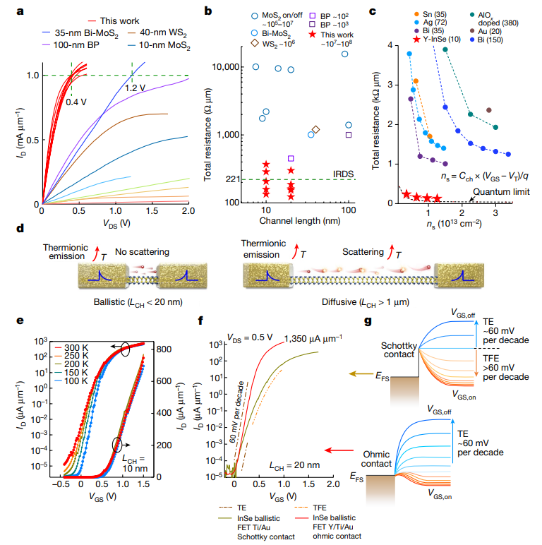 图2 InSe FETs的电子特性及总电阻。a,b,饱和输出特性(最大门电压)和弹道2D InSe FETs和其他2D短通道FETs的总电阻比较。c,在一些有代表性的报告中对总电阻与载流子密度ns进行基准测试。d,晶体管中与温度相关的扩散和弹道传输模式示意图。e,典型的10纳米弹道2D InSe场效应晶体管在不同温度范围从300 K到100 K的传输特性。f,具有欧姆接触的弹道2D InSe FET (Y/Ti/Au,红色)和具有未优化的正常肖特基接触的弹道2D InSe FET (Ti/Au,黄色)的典型传输特性。在转移的阈下区域似乎有两个段Ti/ au接触器件(黄色)的特性,对应热发射(TE)和热场发射(TFE)。g,肖特基接触和欧姆接触的能带示意图。 ©2023 Nature