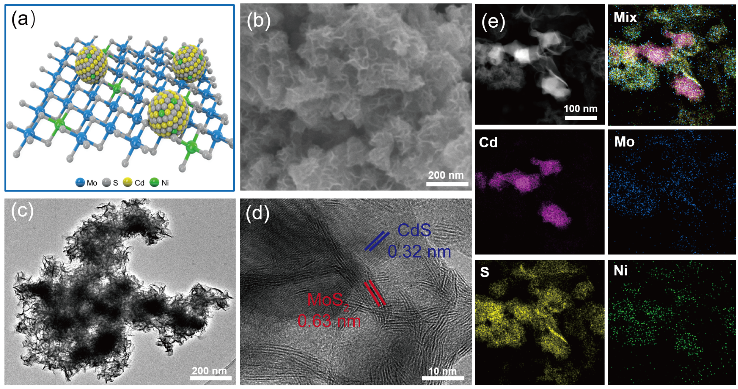 通过SEM、TEM表明MoS2纳米片负载在CdS纳米颗粒上。HRTEM证明了CdS和MoS2异质结的成功构建。EDS Mapping证明了Cd, Mo, S, Ni元素的均匀分布,说明Ni成功均匀的掺杂在CdS/MoS2纳米结构中。