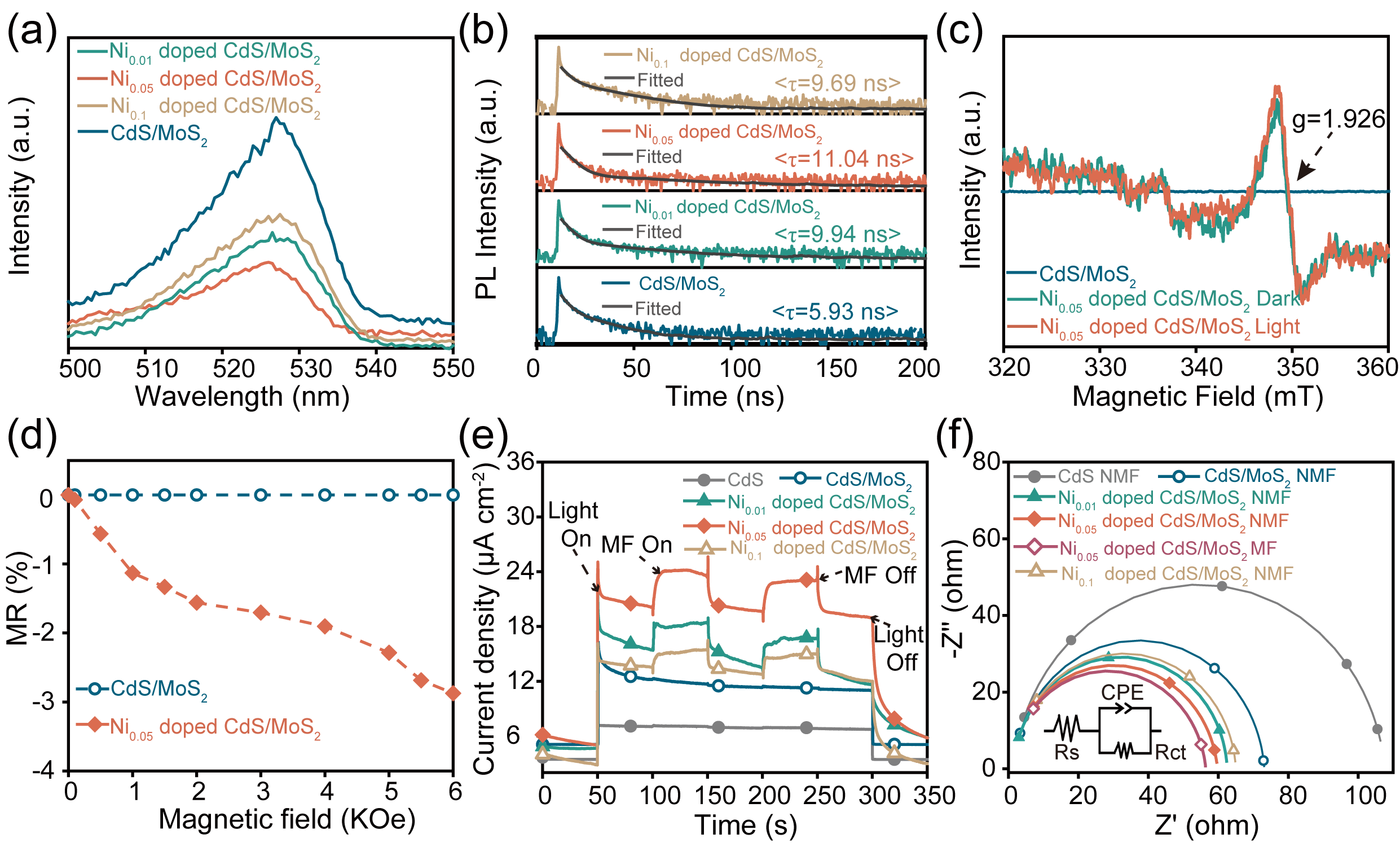 PL谱和TRPL测试进一步证明了Ni doped CdS/MoS2具有更好的光生电子-空穴的分离能力。ESR证明了自旋态Ni的存在,磁场作用下巨磁阻效应有利于光生电子-空穴的传输。I-t光电化学测试表明材料具有良好的光响应,且施加磁场光电流增强,Ni0.05 doped CdS/MoS2增长最明显。有无磁场下EIS测试进一步表明磁场作用下电子传输增强。