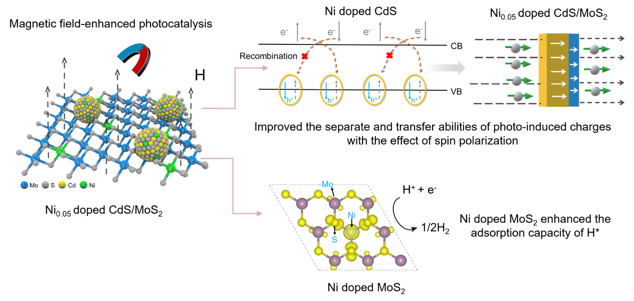 理论计算表明Ni掺杂进CdS和MoS2中赋予材料自旋极化特性。同时Ni 掺杂进MoS2中提高了对H*吸附能力,使得催化活性提高。