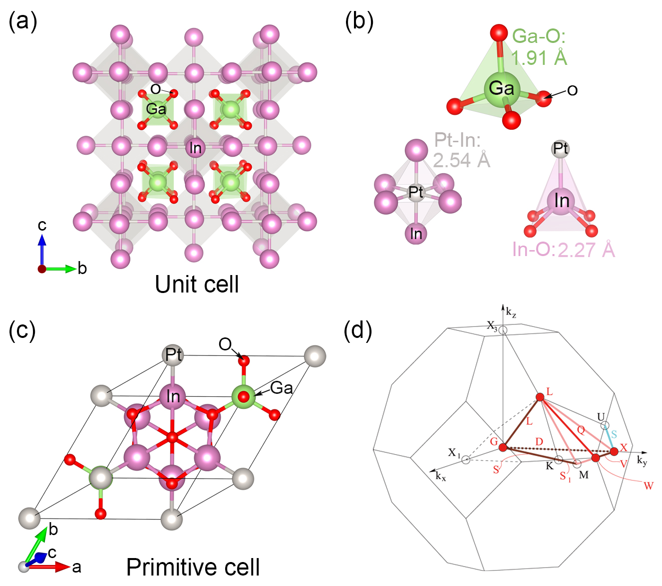 图2 PtIn6(GaO4)2晶体结构(a), 结构基元(b),原胞结构(c),第一布里渊区路径(d) © 2023 American Chemical Society