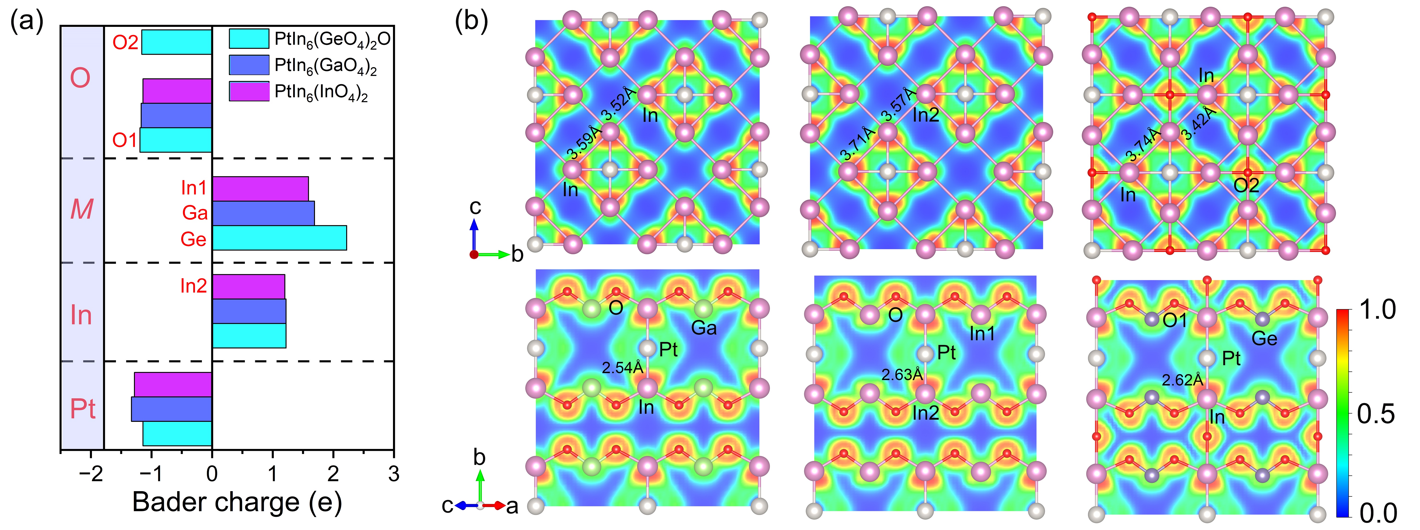 图5 PtIn6(GeO4)2O和PtIn6(Ga/InO4)2的Bader电荷以及ELF化学键分析 © 2023 American Chemical Society